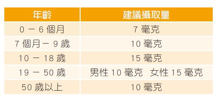 根據衛福部國健署《國人膳食營養素參考攝取量》建議,各年齡層的每日建議鐵質攝取量參考以下圖表