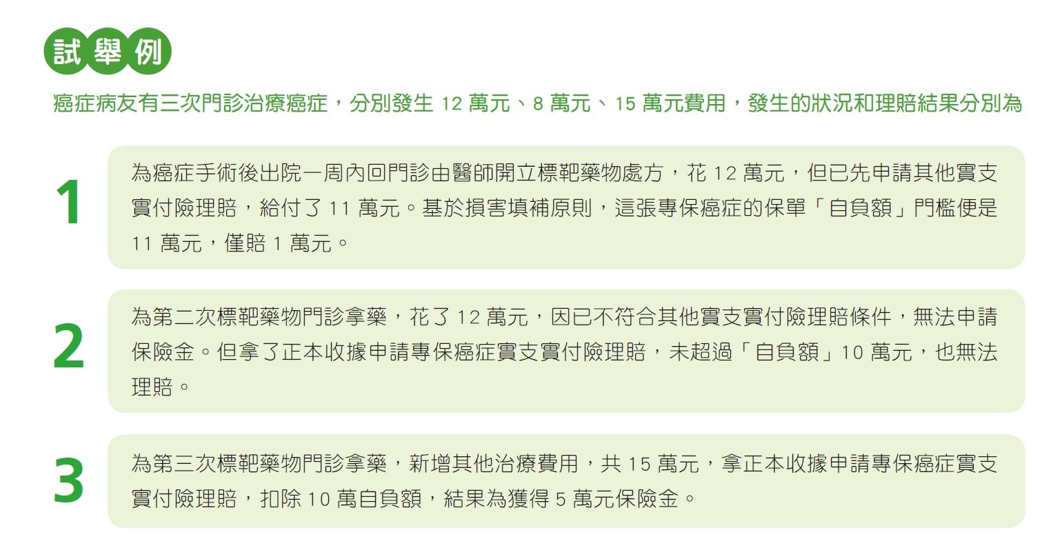 如果保戶已獲得第一種情況的保險理賠,已賠保險金超過10 萬元,或雖有此險但沒有獲得保險理賠,或是先申請專保癌症實支實付險,並還沒獲得其他保險金的理賠,就會適用「自負額」規定的第二種情況:看第一種情況與「自負額」10 萬元,何者為高,較高的金額,為「自負額」的基準門檻。