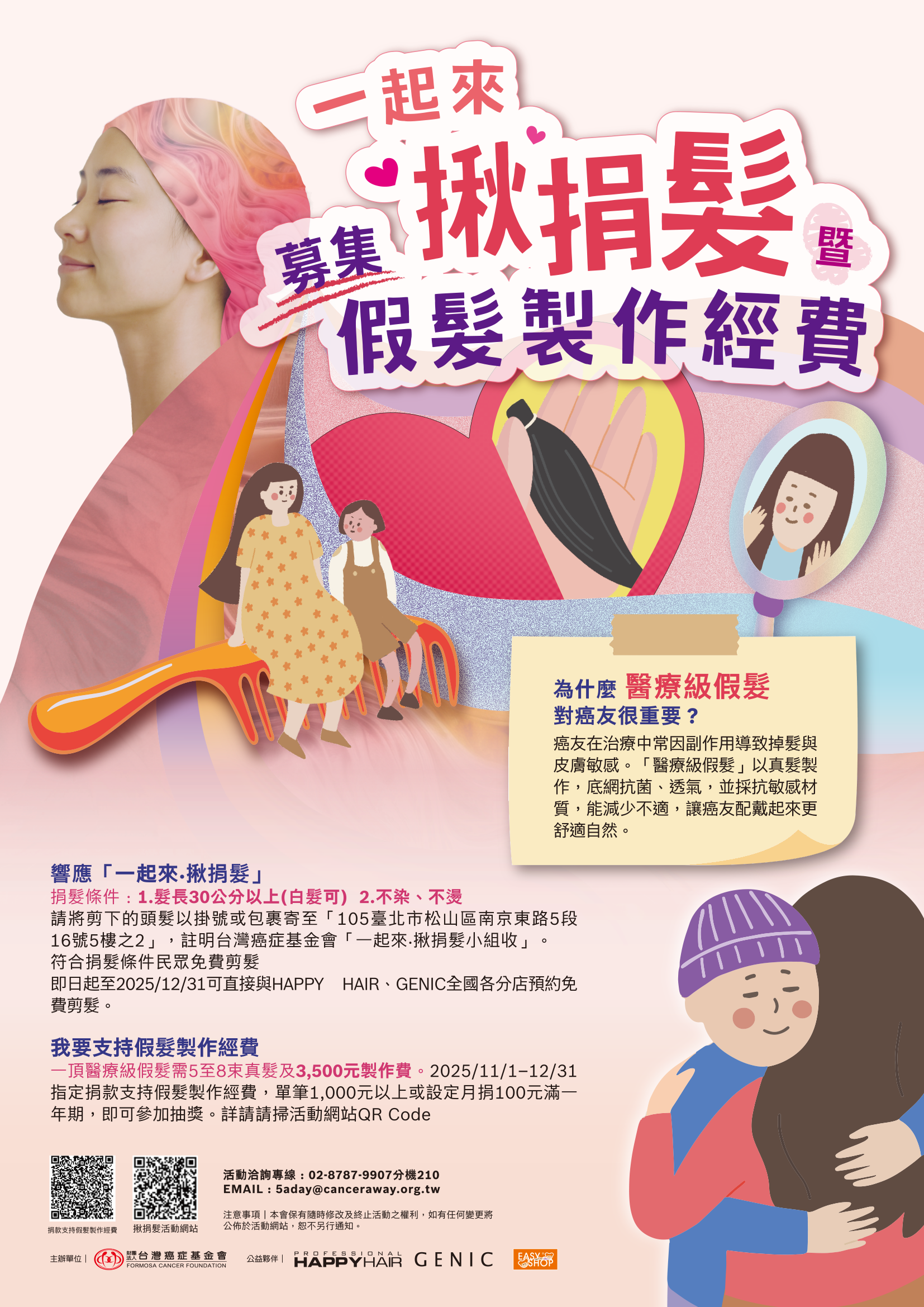 活動期間至2025年12月31日止,單次捐款1,000元以上,或每月固定捐款100元一年期以上,即可參加抽獎活動。您的支持將幫助基金會永續提供「醫療級假髮」租借服務,讓更多癌友受益。