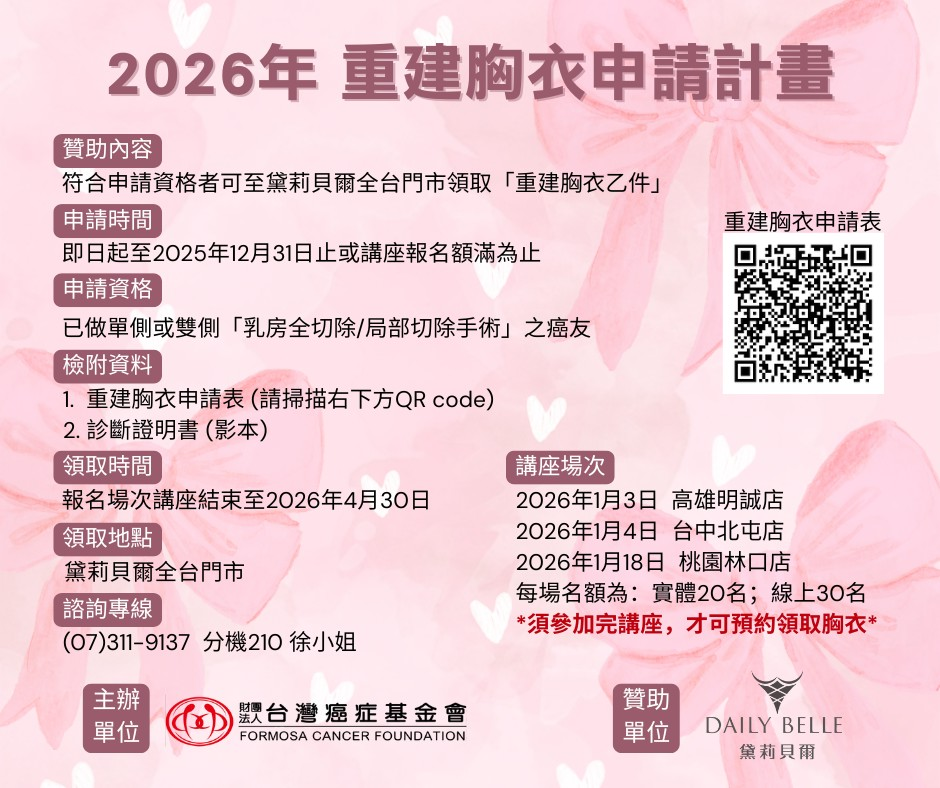 📌申請資格:已做單側或雙側「乳房全切除或局部切除手術」之癌友。(經濟弱勢優先)