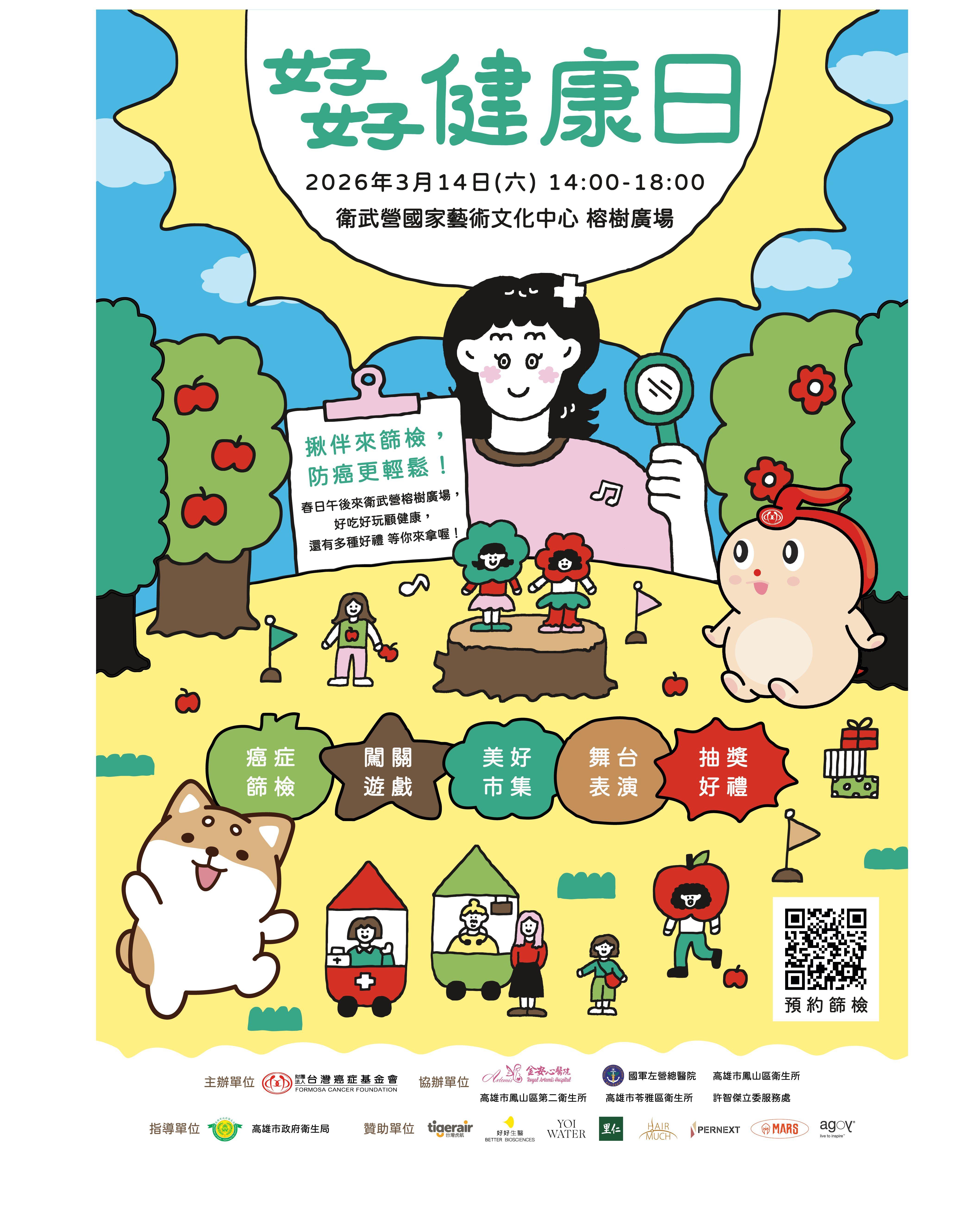 台灣癌症基金會邀請您於3月14日參加「好好健康日」。現場提供免費癌症篩檢,還有休閒市集、闖關遊戲、舞台表演與抽獎好禮。春日午後就來衛武營一同度過健康又快樂的美好時光!
