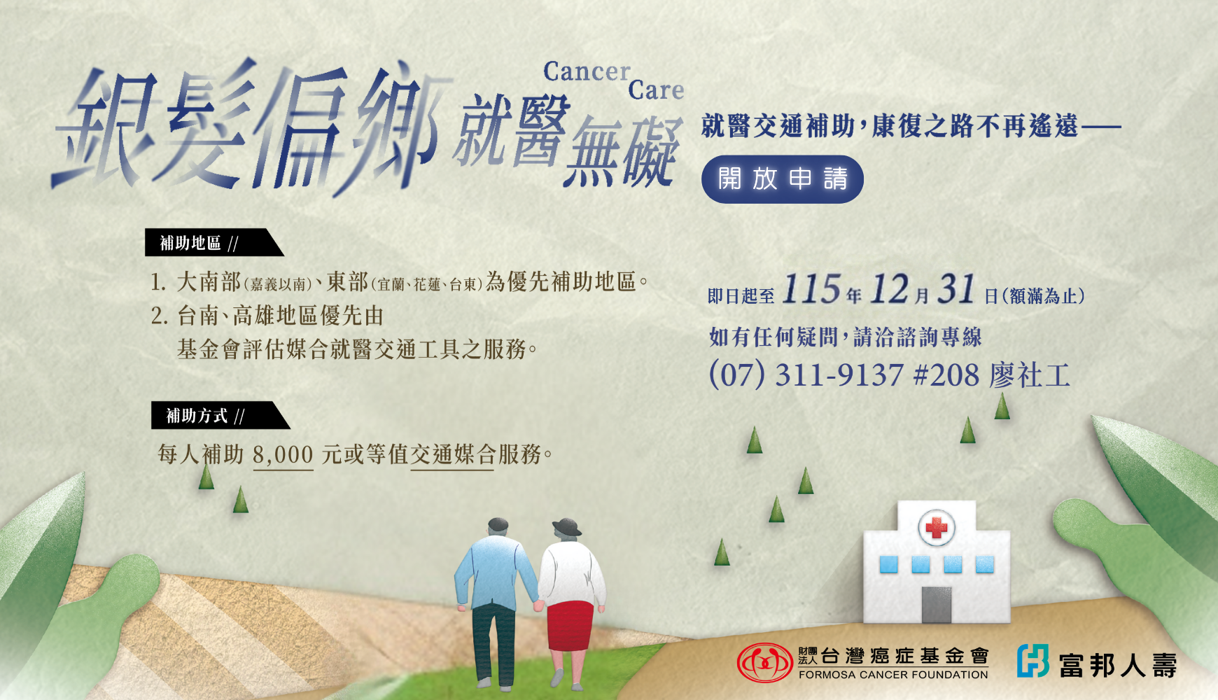 - 銀髮偏鄉 就醫無礙專案:60歲以上癌友,每人補助8,000元或等值交通媒合服務。